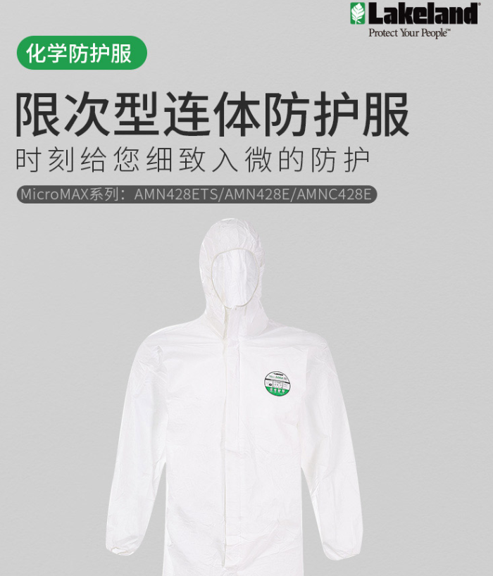 | 中文名称 | (雷克兰)防护服AMN428E化学连体带帽防护服,隔离防飞溅防尘防化 |