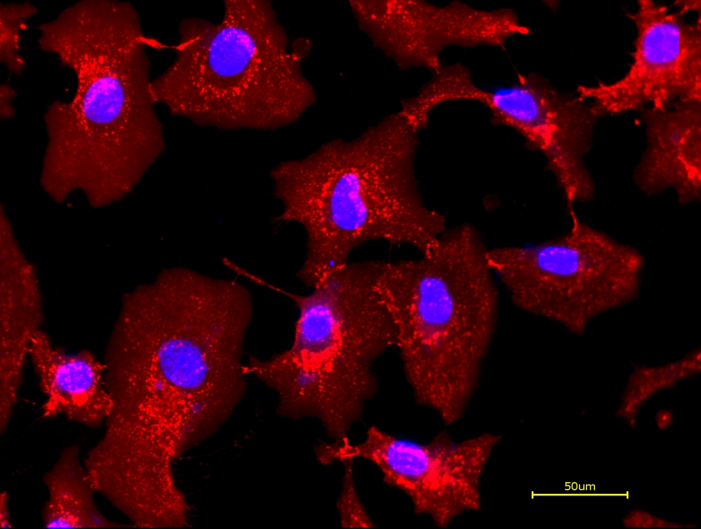 图 1. 使用 iFluor 555-小麦胚芽凝集素 (WGA) 缀合物以 5 µg/mL的浓度在活细胞(Hela细胞) 染色 30 分钟,然后用 Hoechst 33342(Cat# 17535)染色。后使用带Cy3/TRITC 和 DAPI 滤光片组的荧光显微镜成像。