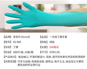 产品特性: 1.ansell安思尔92-600丁腈手套全部由腈构成; 2.抗刺穿性能远远优于天然橡胶手套或乙烯基手套; 3.防护手套质地轻盈舒适; 4.较高的抗油脂性能。